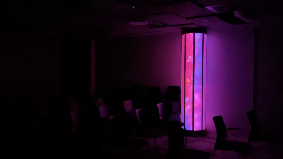LED-ljusslingor med WS2811 individuellt programmerbara lampor, styrda av en Arduino Micro. Mjuka toningar mellan fem ljuslägen baserat på ambient ljus. Lokalen är en hörsal, och när den mörkläggs för att hålla presentation via projektor kan pelarens ljus bli störande i ögonvrån. Därför låter jag pelarens ljus mjukt tona ner när det blir mörkare i lokalen.